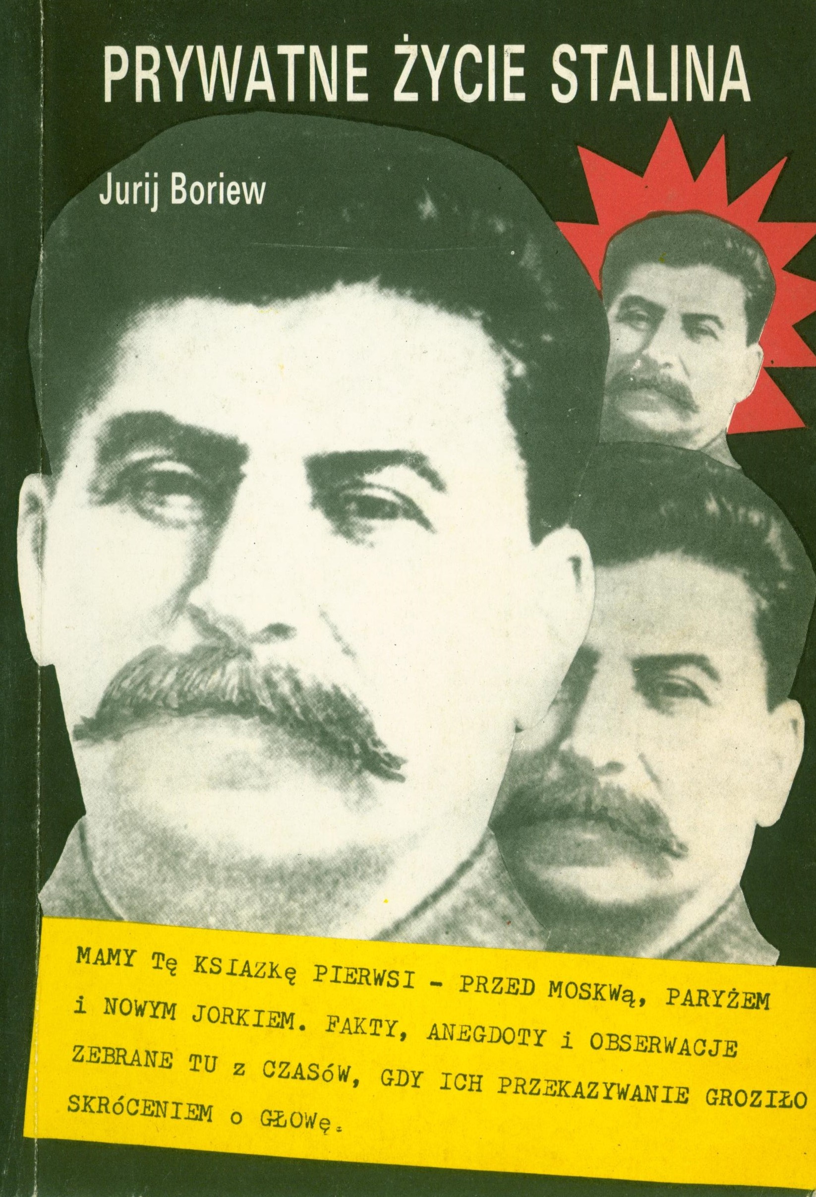 Jurij Boriew - pisarz, filozof. Przez prawie 50 lat zbierał opowieści ludzi, którzy mieli bezpośredni kontakt z krwawym dyktatorem Józefem Stalinem. Z tych relacji powstała właśnie ta książka. Z jej lektury dowiecie się kim był w istocie Stalin, kim byli jego rodzice, ile miał żon, kogo kochał, kogo nienawidził, co jadł i jak mieszkał, w jaki sposób skazywał ludzi i jak ich ułaskawiał... Poprzez Stalina poznacie także wiele niedyskrecji z życia wielkich tamtej epoki: Lenina, Krupskiej, Bucharina, Zinowiewa, Ordżonikidze, Kirowa, Mołotowa, Berii, Ribbentropa, Churchilla, Hitlera, Tołstoja, Gorkiego, Babla, Bułhakowa, Pasternaka, Szołochowa, Fadiejewa i wielu innych. W sumie, poznacie prywatność generalissimusa, który i na naszej historii odcisnął swoje krwawe piętno.