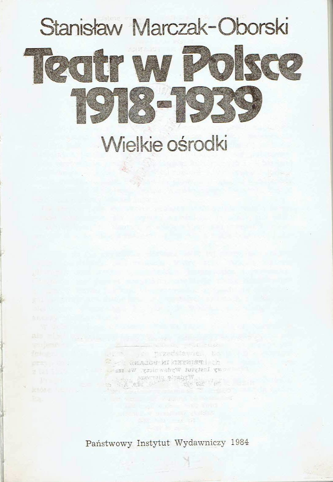 Teatr w Polsce 1918-1939 : wielkie ośrodki / Stanisław Marczak-Oborski. - Warszawa : Państwowy Instytut Wydawniczy, 1984. - 467, [1] strona, [80] stron tablic : ilustracje, faksymilia, fotografie, portrety; 21 cm.
