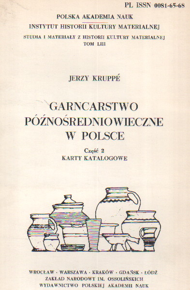 Garncarstwo późnośredniowieczne w Polsce. Część 2, Karty katalogowe / Jerzy Kruppé. - Wrocław - Warszawa - Kraków - Gdańsk - Łódź : Zakład Narodowy im. Ossolińskich, 1981. - 78 kart ilustracji w tece ; 24 cm.